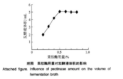 由附圖可知,果膠酶的添加量為0.2%~0.5%時(shí),濾液的體積隨果膠酶的添加而增加,添加量>0.5%后再增加果膠的用量,濾液體積增加幅度較小,因此果膠酶的用量以0.5%為宜。