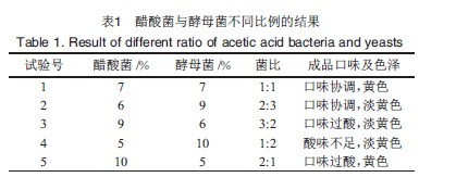 在發(fā)酵液中,酵母菌利用發(fā)酵液中的糖分,發(fā)酵成酒精,同時(shí)醋酸菌把生成的酒精轉(zhuǎn)化成醋酸,酸化發(fā)酵液,不同的菌比所產(chǎn)生的效果(表1)可知,選擇醋酸菌和酵母菌