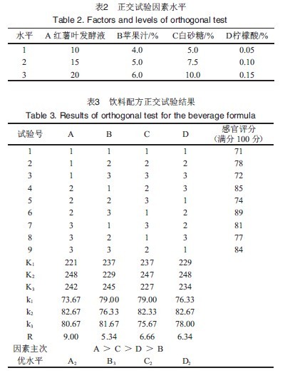 **優(yōu)水平為A2B3C2D2,即紅薯葉發(fā)酵飲料的**優(yōu)配方為紅薯葉發(fā)酵液15%,蘋(píng)果汁6.0%,白砂糖7.5%,檸檬酸0.10%,為了保持飲料的穩(wěn)定性,添加β-環(huán)糊精,添加量為0.8%。按正交試驗(yàn)得出的配方進(jìn)行飲料配制,得到的飲料經(jīng)感官評(píng)分為90分,說(shuō)明此配方**佳。